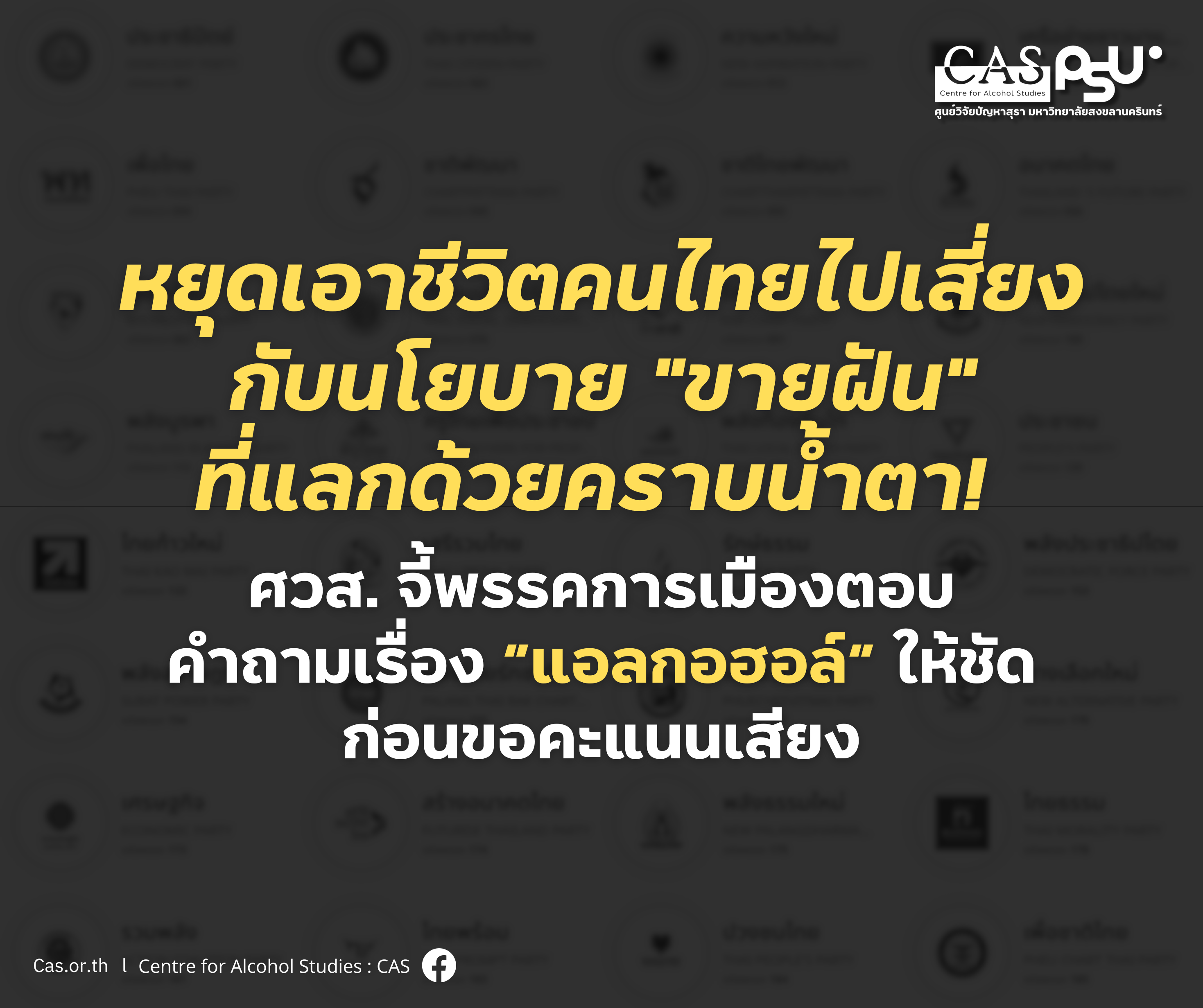 ในการเลือกตั้งครั้งนี้ ศูนย์วิจัยปัญหาสุรา (ศวส.) จะไม่ยอมให้ประเด็น "แอลกอฮอล์" ถูกซุกไว้ใต้พรมอีกต่อไป!