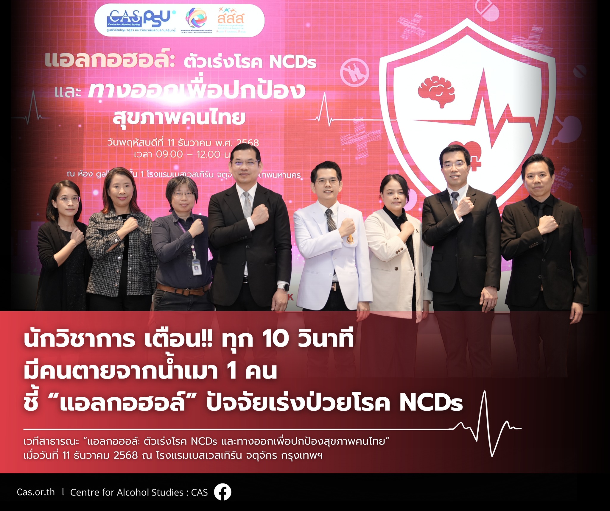 นักวิชาการ เตือนทุก 10 วินาที มีคนตายจากน้ำเมา 1 คน ชี้ “แอลกอฮอล์” ปัจจัยเร่งป่วยโรค NCDs เกินครึ่งป่วยไม่รู้ตัว สร้างความเสี่ยหายทางเศรษฐกิจ 1.65 แสนล้านบาท สสส.-ศวส. หนุนมาตรการป้องกันที่เหมาะสมกับบริบทพื้นที่-บูรณาการทุกภาคส่วน หวังลดผลกระทบจากน้ำเมา