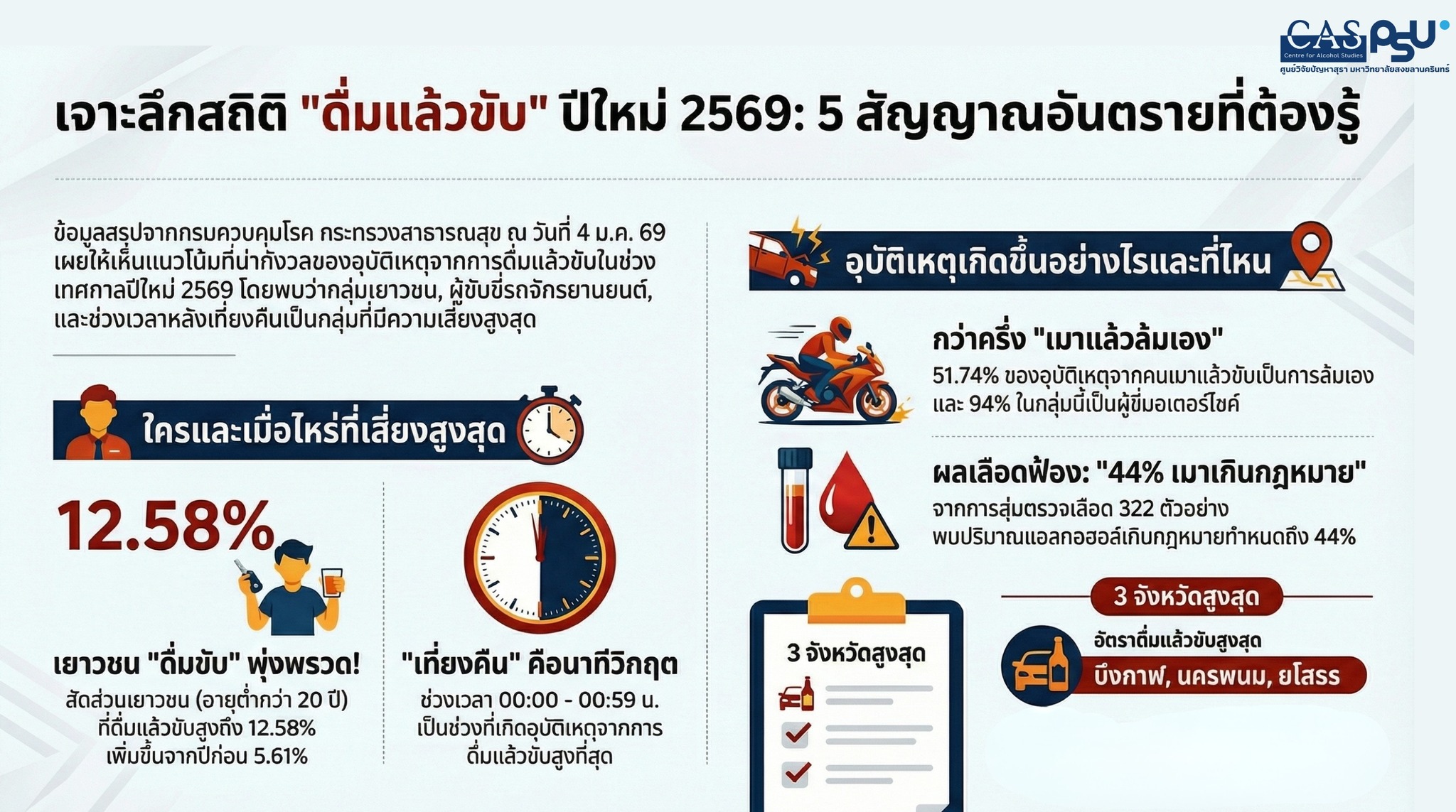 ศูนย์วิจัยปัญหาสุรา (ศวส.) ขอเล่าข้อมูลเฝ้าระวังจาก กรมควบคุมโรค กระทรวงสาธารณสุข (ข้อมูล ณ 4 ม.ค. 69) พบสัญญาณอันตรายจากพฤติกรรมการดื่มแล้วขับที่ซ่อนอยู่ในตัวเลขสถิติ โดยมี 5 ประเด็นสำคัญที่ต้องรู้ ดังนี้: